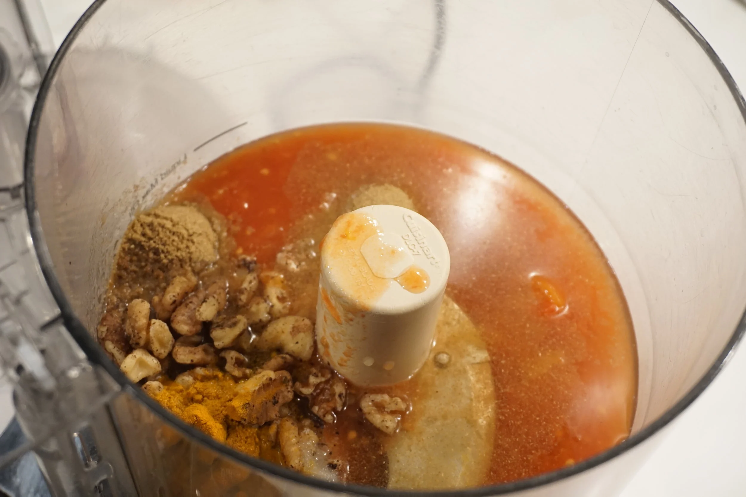 In a food processor or blender, add tomatoes, ginger, nuts, coriander, and turmeric. Process until smooth. Set aside.