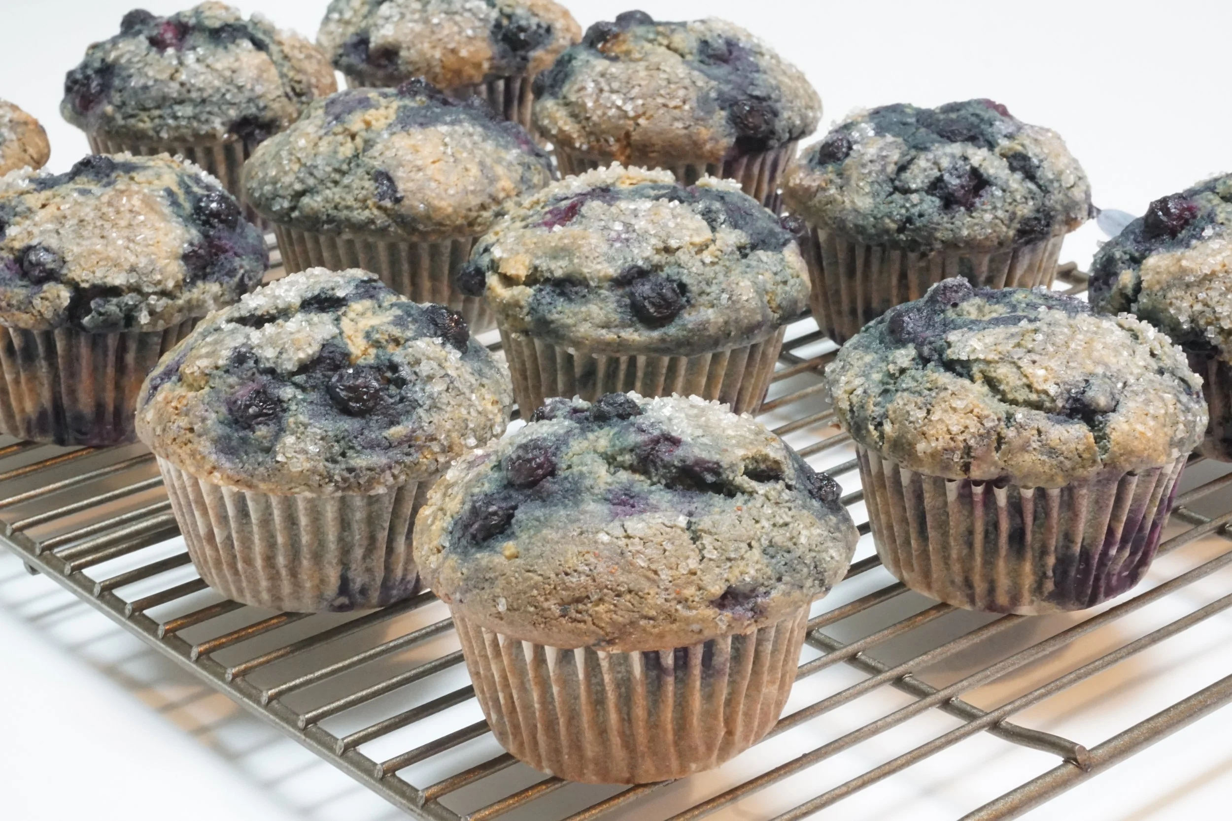 Bake for 12 minutes. Reduce heat to 350F. Continue baking for 10-16 minutes or until muffins are fragrant, puffed, and golden around the edges. Fresh blueberries will take a shorter amount of time than frozen. An inserted toothpick should re-emerge with some moist crumbs attached but no wet batter. Use a small offset spatula to remove from tin and transfer to cooling rack.